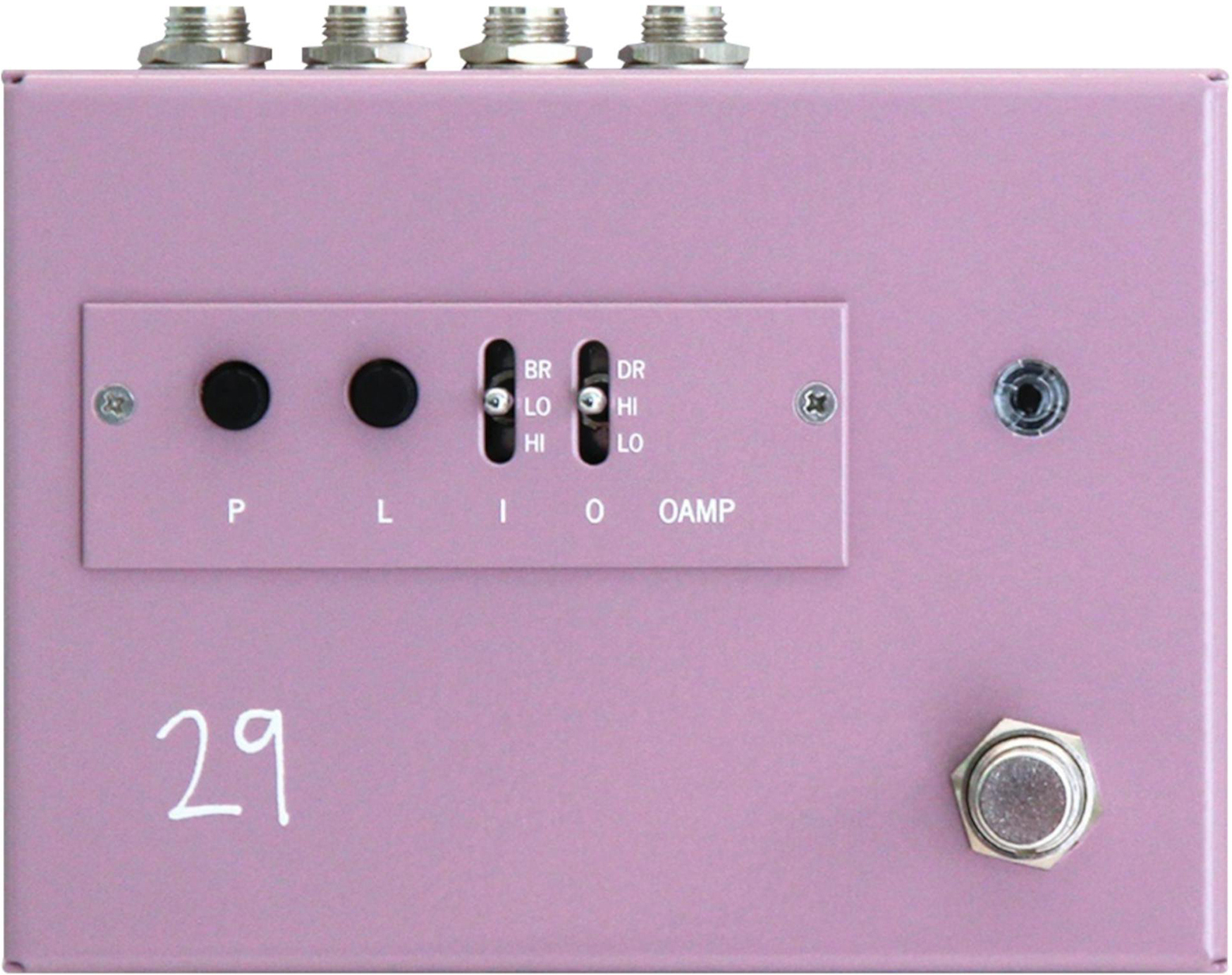 29 PEDALS OAMP Output Amplifier is an output driver designed to replace a conventional output buffer or gain pedal at the end of your chain. If you’re familiar with EUNA, it’s a similar concept but with a few key differences. High headroom, clean gain, great drive capability. They key features are labelled below. There are subtle tonal variations in the gain settings. Maximum clean output level is 20dB. 29dB of gain available.