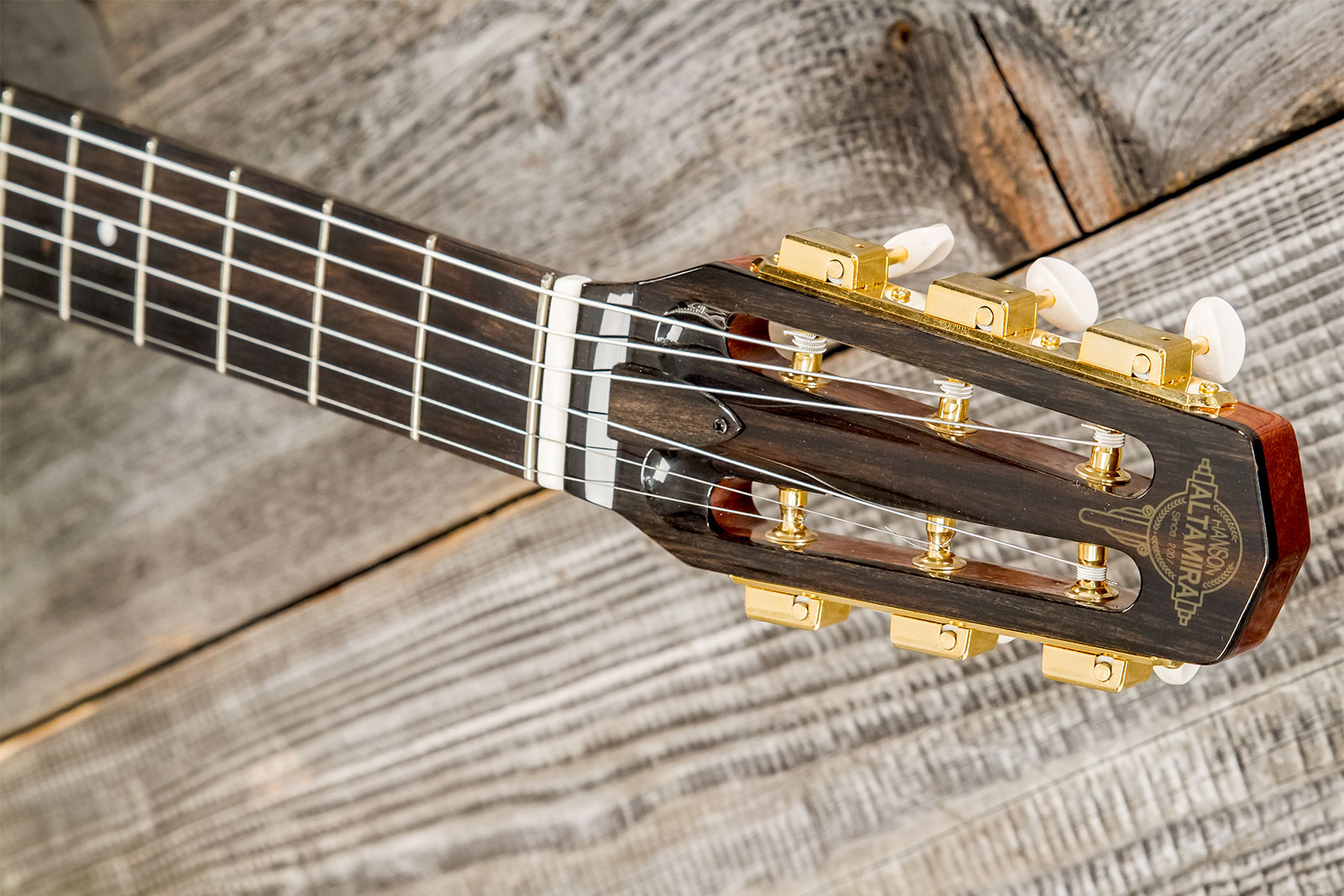 Featuring solid european Spruce, layered indian Rosewood back/sides, Mahogany neck and Ebony fingerboard, the ALTAMIRA Gypsy Jazz M01F Natural Gloss guitar is a Selmer-Maccaferri style instrument with stylish F holes, that captures the quintessential punchy and growling Manouche tone.