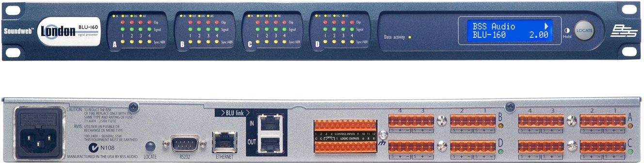 This SoundWeb London model incorporates a fully programmable DSP processing unit with Audio Architect software, as well as a Blu-Link audio data transport interface.