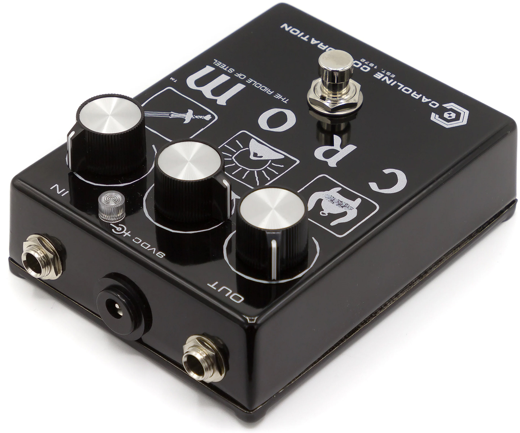 CAROLINE GUITAR Crom The Riddle Of Steel Fuzz compact effect pedal is a BC184 Supa Tone Bender style fuzzstortion like our original Olympia™, but with a classic tweed amp style tone control (MOUNTAIN) that interacts with the SWORD (gain) control. It is a LOT less lossy and less scooped than the classic M*ff style tone control in these circuits, giving the pedal an immediate and punchy response. A TURBO button on the side gives it extra power and gain.