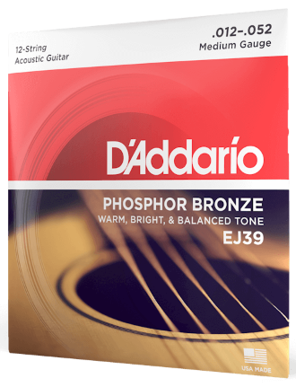 D'Addario's EJ39 12-String Acoustic Guitar Strings Medium offers a higher tension for a more powerful, resonant acoustic sound and better resistance to strumming or aggressive pick playing.Phosphor bronze was introduced into string making in 1974 by D'Addario, and has subsequently become synonymous with warmth, brilliance and balance in sound. The result: brilliant, long-lasting tones with excellent intonation.