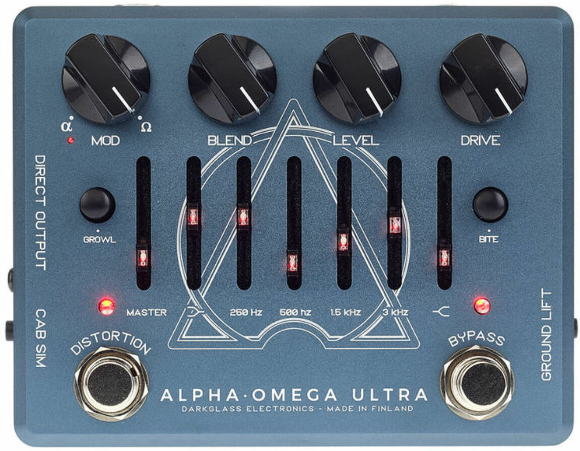 The DARKGLASS Alpha·Omega Ultra V2 (Aux In) is a versatile bass preamplifier / distortion pedal for bass created by the Finnish company : with its two distinct distortion circuits (Alpha and Omega), extremely high dynamic range, six-band active graphic EQ, dedicated headphone output and balanced direct output with switchable digital impulse-response cabinet emulation make for an incredibly complete tool for the modern bass player.