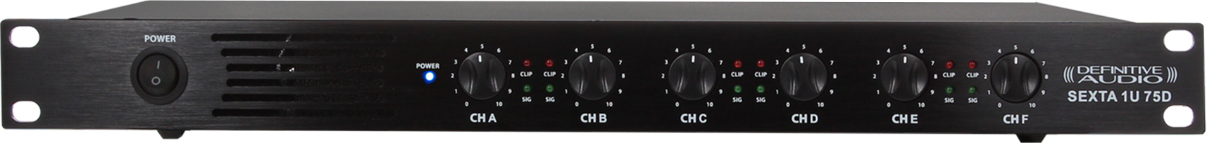 The Definitive Audio SEXTA 1u 75D is a 1U 6x75W RMS amplifier rated at 4 ohms.
