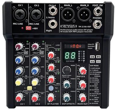 The TM 22 BU-USB is a 5-channel analogue mixer, with 2 XLR/Jack 6.35mm combo inputs and a 3.5mm stereo AUX input. It also features a Bluetooth receiver and USB recorder/player. The mic preamps are of the highest quality, so you can be sure of flawless performance. It's equipped with a digital multi-effects with 99 presets, including all the main effects you'll need for normal use.