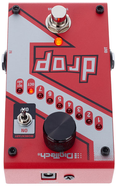 The DigiTech® Drop is a dedicated polyphonic drop tune pedal that allows you to drop your tuning from one semitone all the way down to a full octave. Get down-tuned chunk without having to change guitars! The Drop also features a momentary/latching switch. With the switch set to momentary, you can turn the Drop into a true performance pedal. Fast trills and roller-coaster pitch dips are at the tip of your toes.