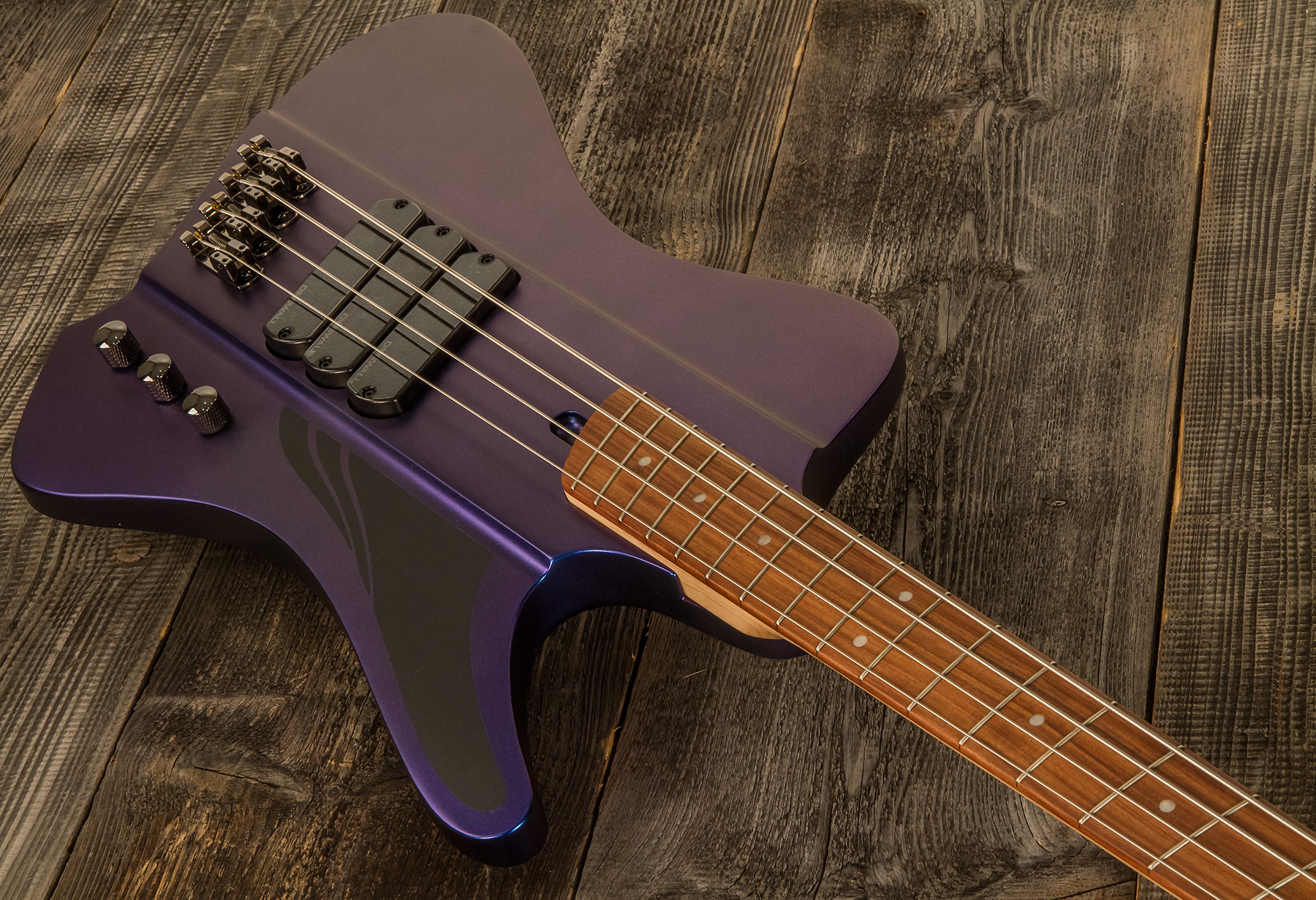 DINGWALL D-ROC 4 Standard 3-pickups (PF, Blue To Purple Colorshift) is a solid body electric 4-string bass with Mahogany body, high stability 5-pieces Maple neck, 20 fan frettes multi-scale fingerboard.