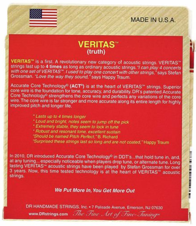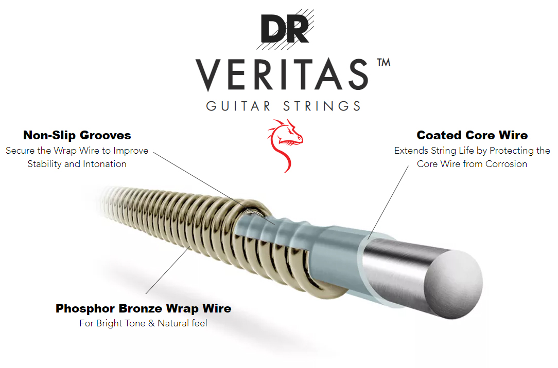 DR STRINGS VTA-13 6-String Set Veritas Phosphor Bronze Acoustic Guitar Medium 13-56 maintain their tone, tuning stability and intonation thanks to Coated Core Technology™, a process of coating the round core wire, which locks the wrap wire in place and extends string life by protecting the core from corrosion.