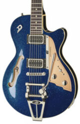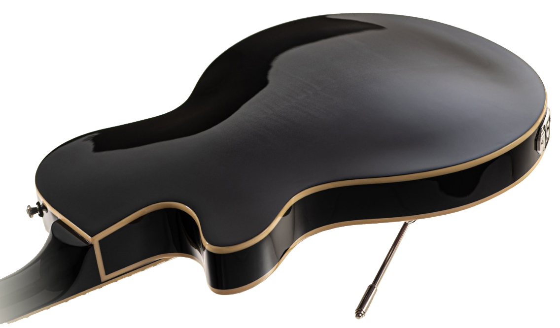 The DUESENBERG Starplayer TV (Black Sparkle) semi-hollow body electric guitar (with internal sustain bloc), is constructed the same way as regular Starplayer TV (semi-hollow, dual pickup, 22 fret electric guitar, Spruce arched top and Maple back - layered tonewoods), bent sides and a 648 mm scale.