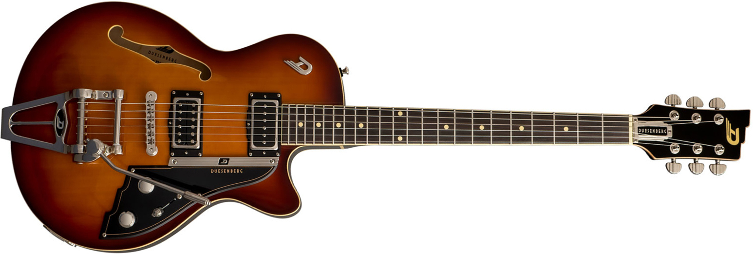 The DUESENBERG Starplayer TV (Vintage Burst) semi-hollow body electric guitar (with internal sustain bloc), is constructed the same way as regular Starplayer TV (semi-hollow, dual pickup, 22 fret electric guitar, Spruce arched top and Maple back - layered tonewoods), bent sides and a 648 mm scale.