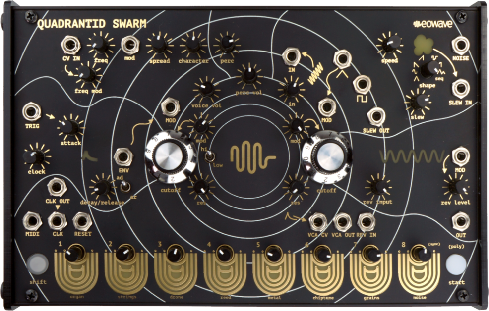 The Quadrantid Swarm is a hybrid analog/digital synthesizer consisting of 9 generators (8 plus a percussion), 2 2-pole analog filters, a VCA, an envelope, an LFO with 8 waveforms and a spring reverb.