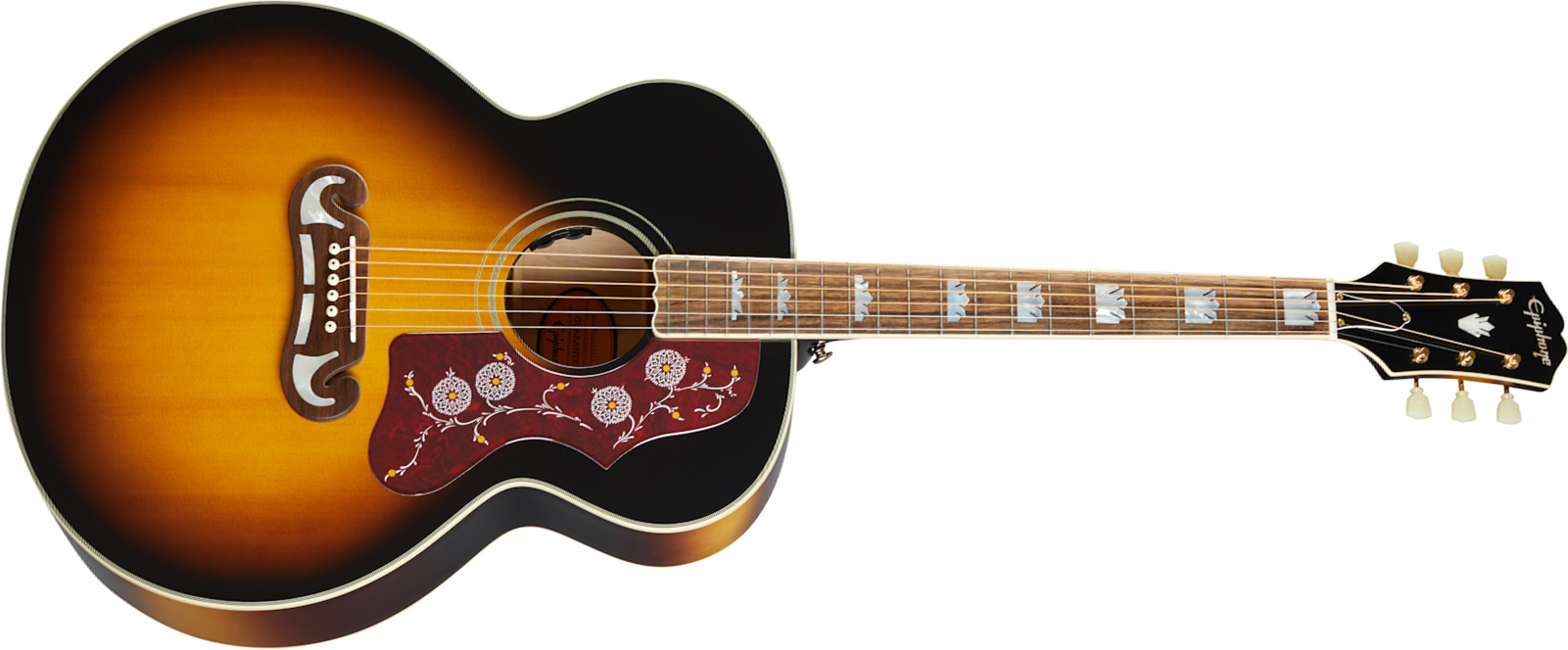 Since its introduction in 1937 it has been the choice of "singing cowboys" like Tex Ritter and Gene Autry, as well as folk, rock and country royalty, including Emmylou Harris, Elvis, Jimmy Page, Bob Dylan, George Harrison, The Edge, and many more. Featuring a Super Jumbo non-cutaway solid figured maple body, solid Sitka spruce top, and two-piece maple neck with a mahogany center strip, the Epiphone J-200 is built with all solid woods for outstanding tone. The visual elements have always been a big part of the J-200's appeal, and the Epiphone Inspired by Gibson J-200 includes a Moustache™ bridge with curved block inlays, Crown headstock inlay and Graduated Crown mother of pearl fingerboard inlays, and a J-200 style pickguard with two-color graphics.