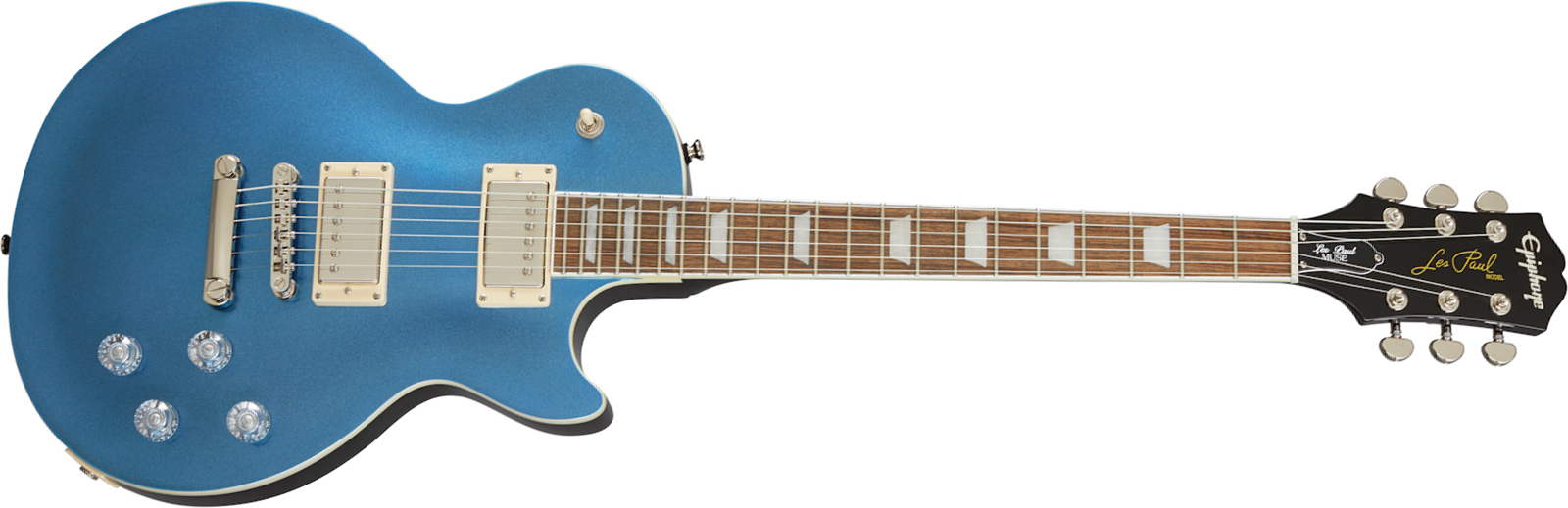 The EPIPHONE Modern Collection Les Paul Muse (ENMLRBMNH1) solid body electric guitar from the 2020 Inspired by Gibson Collection features a lightweight chambered Les Paul body powered by high output Alnico Classic PRO™ humbuckers with a coil-splitting and phase controls plus a treble bleed circuit to maintain clarity at lower volumes. Available in all new metallic finishes including Radio Blue Metallic, Wanderlust Green Metallic, Purple Passion Metallic, Jet Black Metallic, Smoked Almond Metallic, Pearl White Metallic, and Scarlet Red Metallic