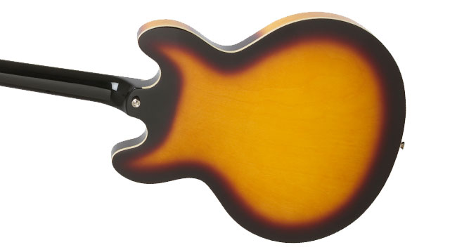 EPIPHONE Archtop Casino Left Handed (ETA4LVSNH3) semi-hollow body electric guitar features Dogear P-90T Classic™ pickups and a 5-ply maple body with basswood top bracing.