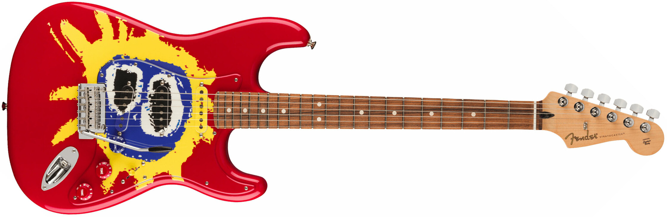 The FENDER Limited Edition Screamadelica 30th Anniversary Stratocaster (0141063350) solid body electric guitar commemorates this pivotal recording with a one of kind all-over graphic of the stunning red, yellow and blue album art – including matching pickguard, pickup covers and knobs.
