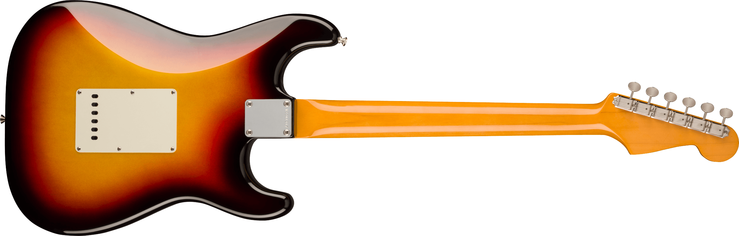 During the late ‘50s and early ‘60s, the popularity of Fender musical instruments flourished, and although the Fender assortment had expanded to include many great new instruments, the Stratocaster® reigned supreme. By 1961, the Stratocaster had taken on a more refined aesthetic, with a 3-Color Sunburst reformulated with a more vibrant red and bolder black edge, topped with a 3-ply pickguard accenting the Strat’s signature curves.