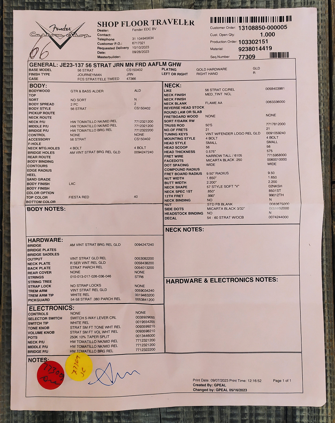 AA flame Maple neck ('57 Style Soft V profile, 9.5" radius), AA flame Maple fretboard (narrow-tall frets, 9.5" radius), Custom Shop Hand-wound Tomatillo Alnico 2 pickups and traditional/vintage-style parts.