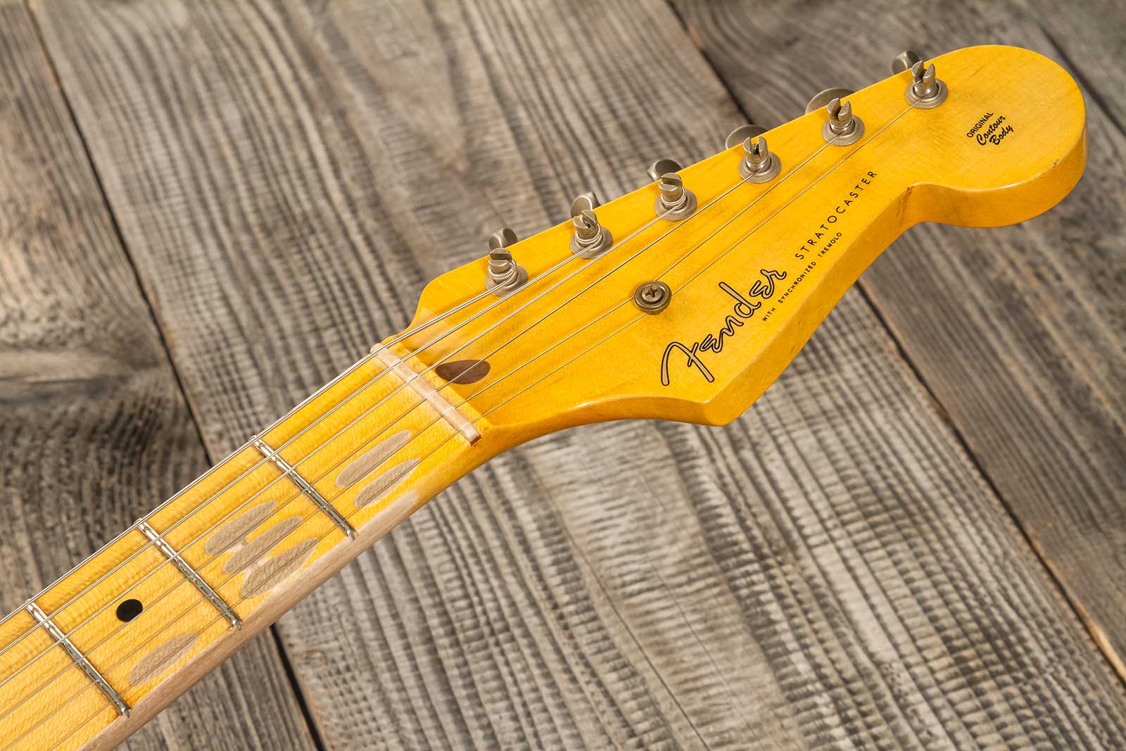 Its one-piece quartersawn maple neck is fashioned with a special 70th anniversary Soft “V” profile based on an incredible Strat® neck from July 1954. This is topped with vintage compound-radius fingerboard (7.25” to 9.5”) with 21 medium vintage (47095) frets and a 1.625” bone nut. Three Custom Shop hand-wound ’54 Strat® pickups deliver that classic Strat® voice with clear, bell-like highs, routed through vintage '54 Strat® wiring with wax paper cap and five-way switching.