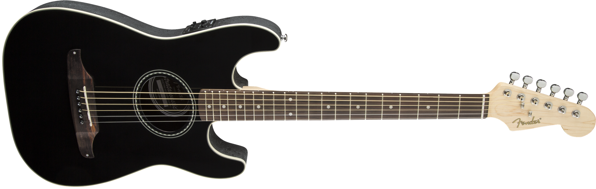 The 2017 FENDER Stratacoustic Standard (0967300006), new version with Walnut fretboard, is an acoustic/electric travel guitar that merges features of an elecric and acoustic (laminated Spruce top, fiberglass back/sides, Fishman Isys III preamp wit tuner.