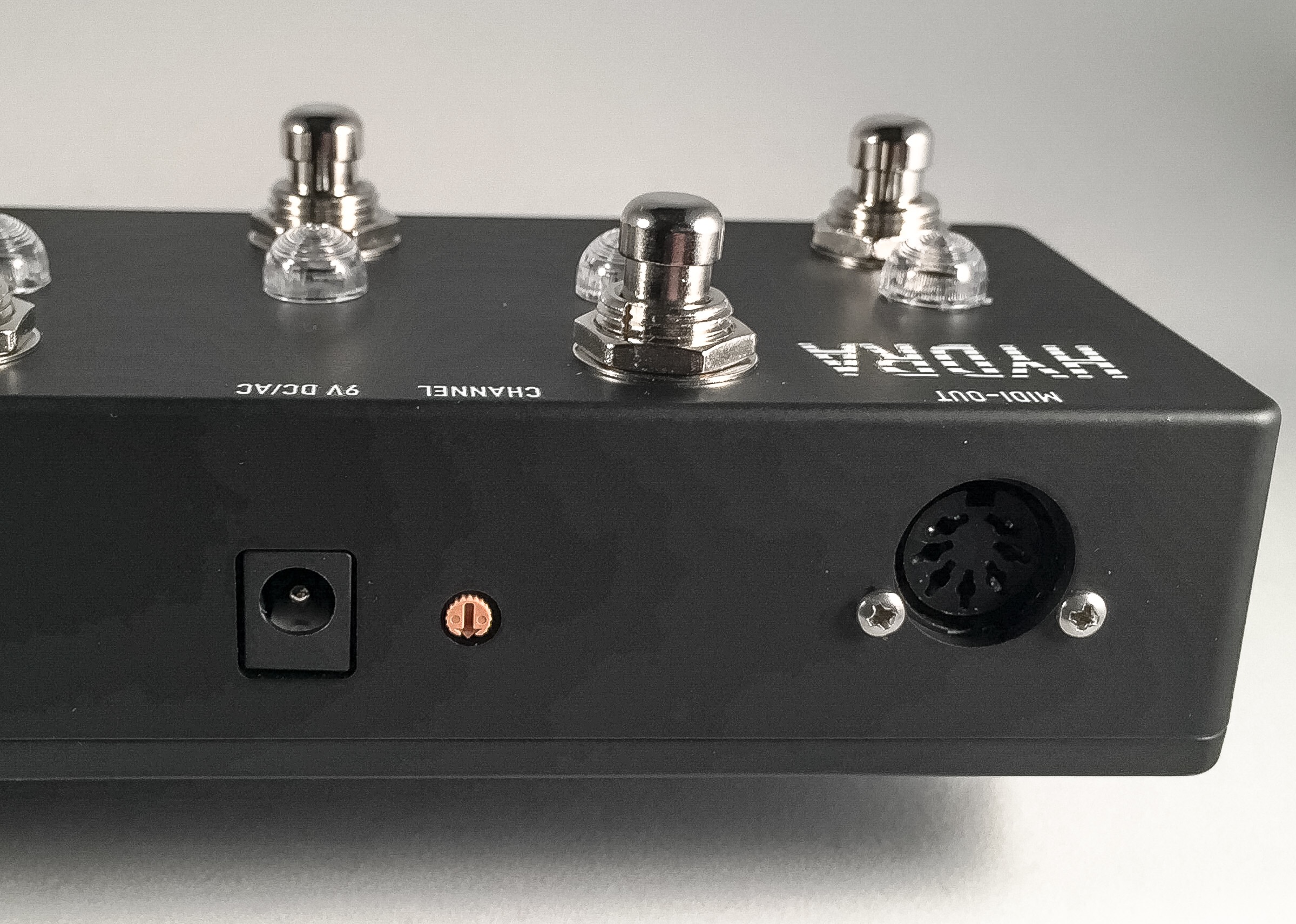 Retaining the smallest possible footprint for fly date and tight pedalboard applications, the FORTIN AMPS Hydra Midi Foot Controller features 8 buttons, multiple power supply mating, DC/AC inlet or outside pins on 7 pin MIDI out connector, program change 0-8, external midi channel select 1-16 and high bright blue LEDs for stage use.