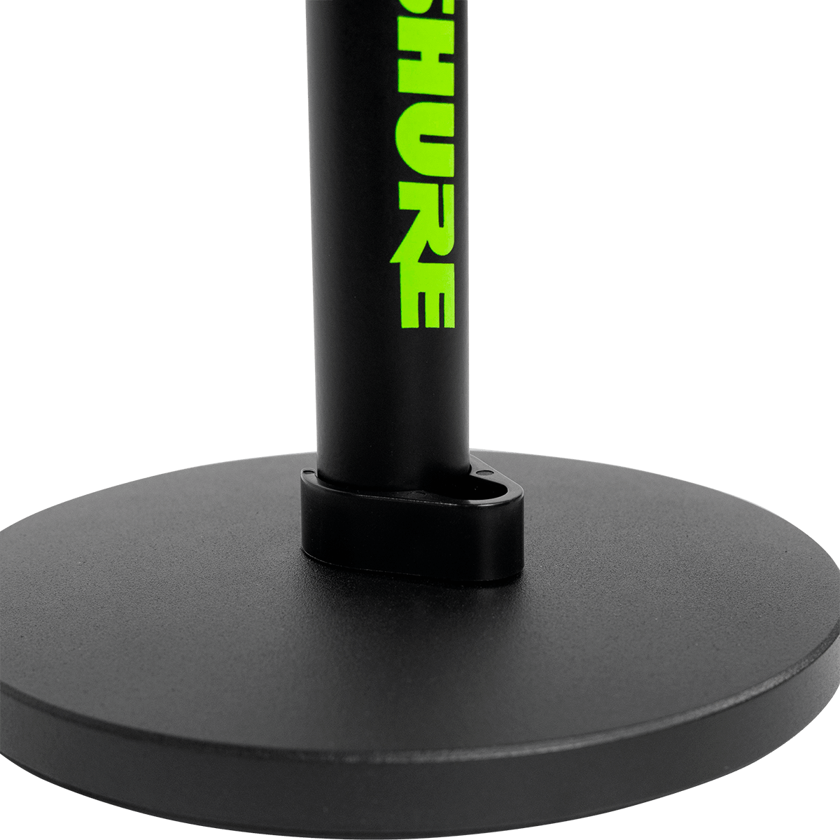 Shure Desktop Microphone Stand with 6-inch Round Base and Clamp Handle for Height Adjustment.