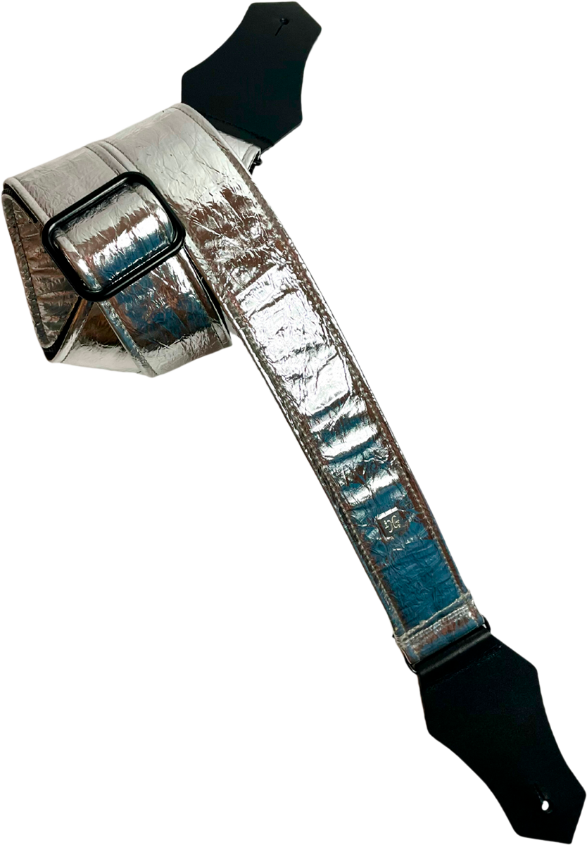beautiful textures and prints in the Get'm Get'm range. Shine like a rock star with the new Distressed Vernice straps from Get'm Get'm. They feature a textured, pleated and patinated faux leather, with a glossy finish sheet, available in 6 colors - here in a sparkling silver. With a fully adjustable length of up to 165cm, these straps are perfect for guitarists of all sizes! Their black finished welded metal accessories are free of heavy metals and harmful substances.