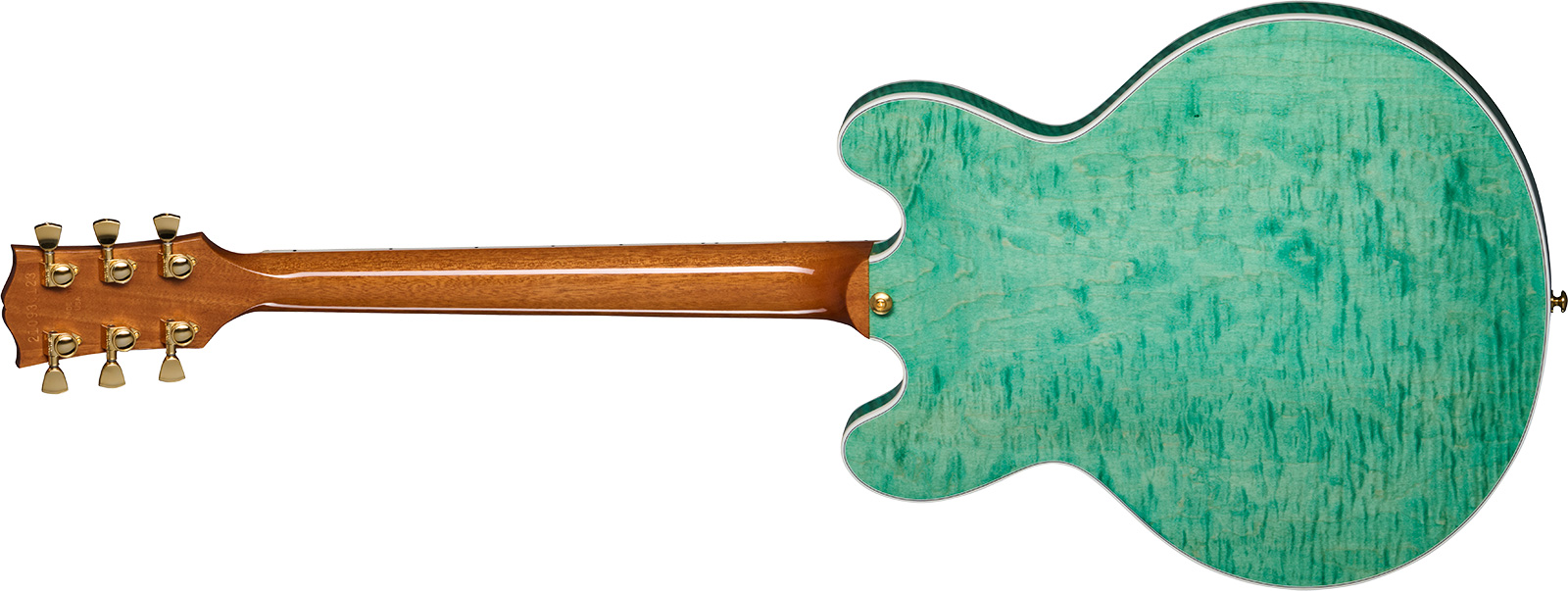 that take the ES™ to new heights of beauty, including a 3-ply body with a AAA figured maple top, Super Split Block mother-of-pearl neck inlays, gold hardware, and a striking mother-of-pearl headstock inlay inspired by a design from the 1940s that was discovered in the Gibson archives.