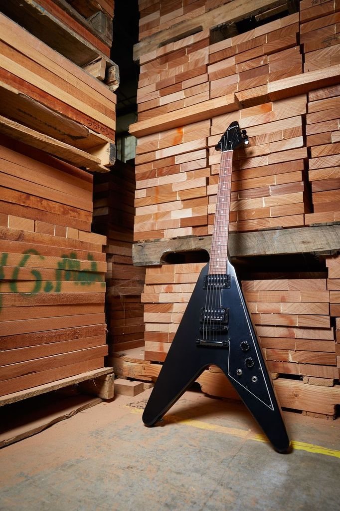 The GIBSON Flying V Tribute 2019 (DSV219SECH1) solid body electric guitar, with solid tonewoods (Mahogany body and set-neck, Rosewood fingerboard), and a set of Gibson Dirty Fingers Ceramic humbucking pickups, is alongside the Gibson Explorer, the archetypal Hard/Heavy Rock guitar.