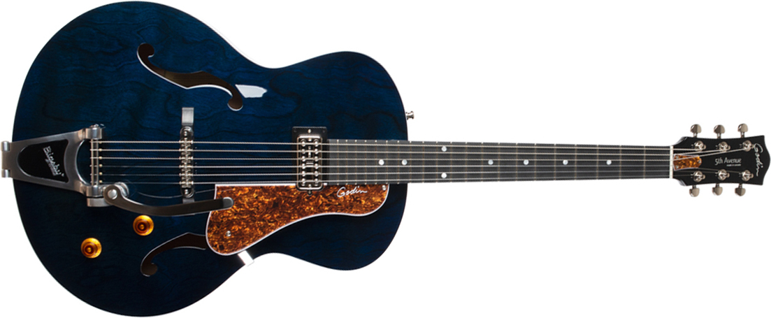 The GODIN 5th Avenue Nightclub (047826) can be described by one word: Classy. Adorned in a stunning Indigo Blue finish, this guitar is not only a treat to look at but has awesome playability and a rich tone that matches its beauty.