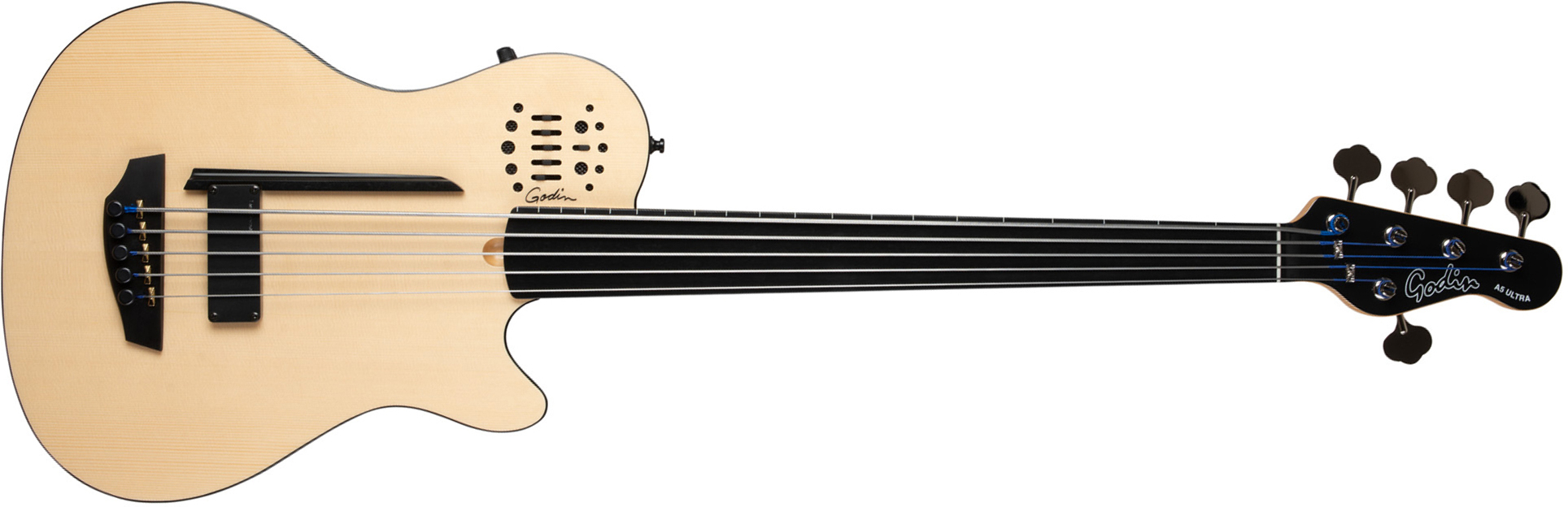 Godin is proud to present the redesigned GODIN A5 Ultra Natural Fretless A/E (050789) Semi-Acoustic Bass! An instrument that remains true to Godin’s high-quality build and design innovation standards.