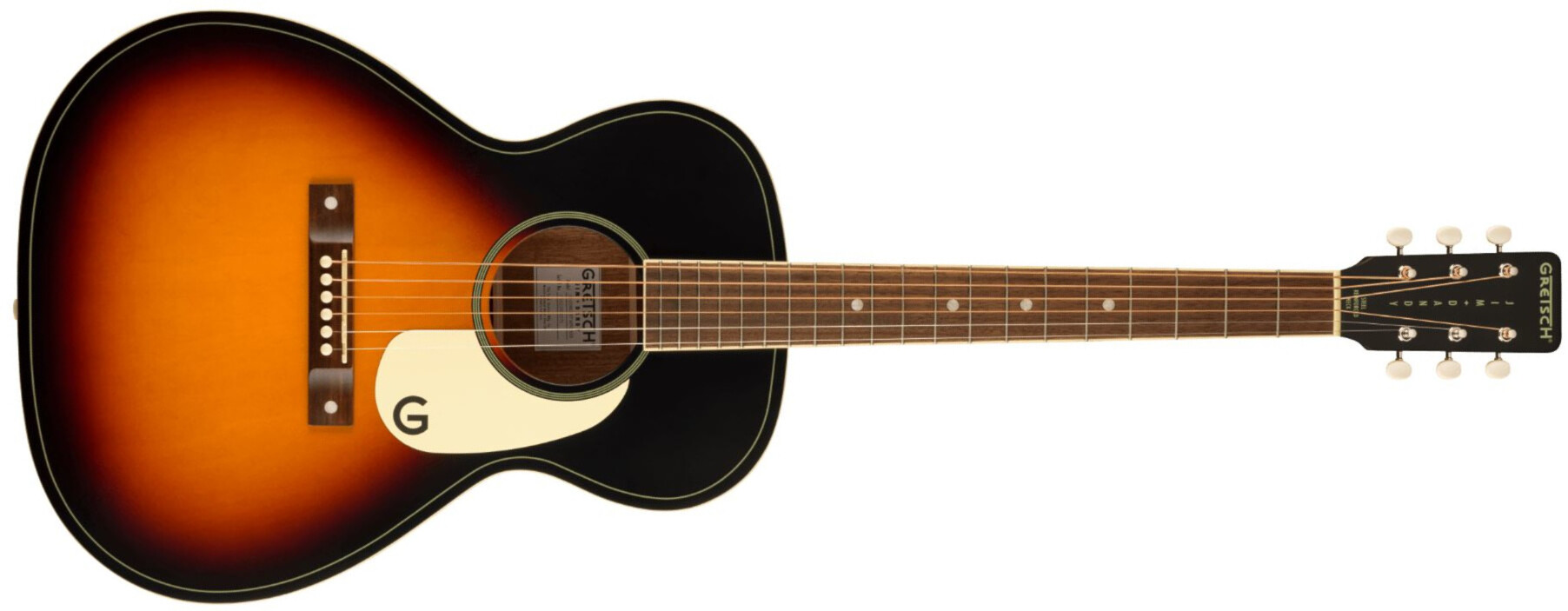 The X-braced body is crafted with select lightweight laminate tonewoods for an optimal balance of woody vintage tone and reliable durability, while the “C”-shape neck presents an inviting feel for hours of old-timey inspiration. Period-correct details such as a vintage-style pinned bridge, “G”-graphic pickguard, painted pinstripe purfling, 3-on-a-plate open-gear tuning machines and oversized dot fingerboard inlays combine for a nostalgic personality destined for any barnburner or jamboree.