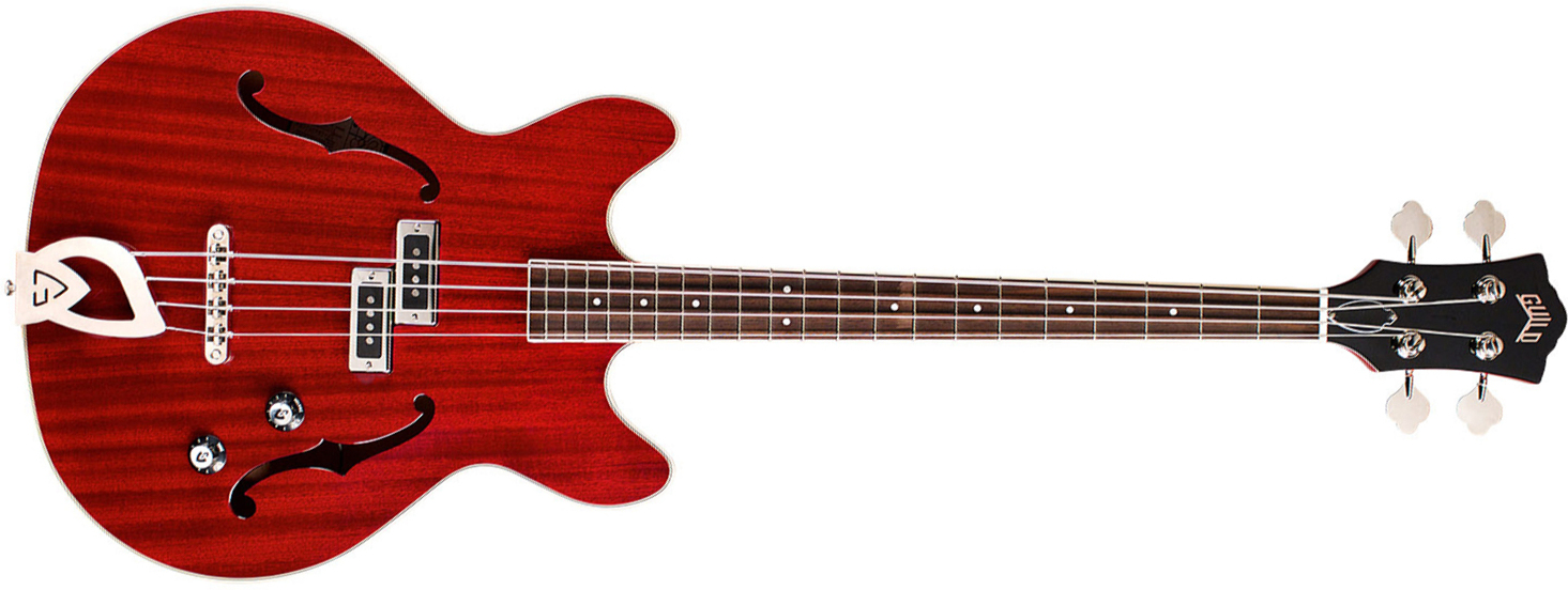 An iconic shape at an affordable price, GUILD Newark St. Collection Starfire I Bass (Cherry Red) semi-hollowbody electric bass is a modern adaptation of the traditional Starfire Bass platform.