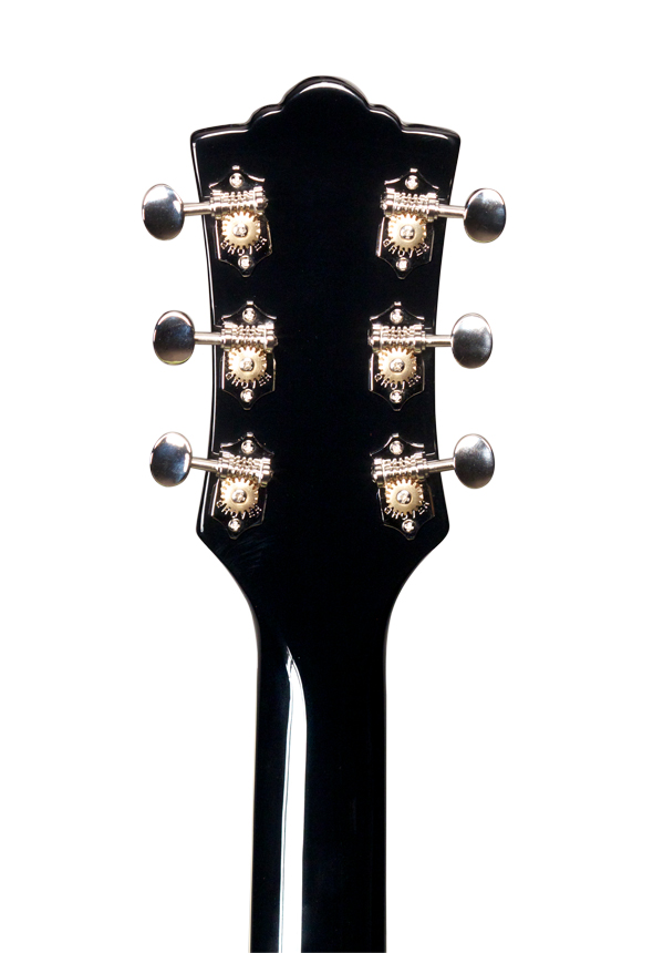Other premium features include bound three-piece mahogany/maple/mahogany neck with vintage-style “soft U” profile, 22-fret rosewood fingerboard with 9 1/2" radius and pearloid block inlays, three-way pickup selector switch, individual volume and tone controls for each pickup and master volume, Tune-O-Matic bridge with rosewood base, Guild vibrato tailpiece, Grover Sta-Tite™ tuning machines, nickel hardware and a gorgeous Black finish. Includes plush-lined hard-shell case.