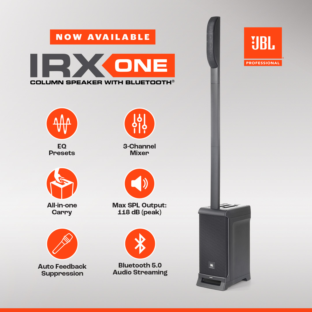 The JBL IRX ONE sets a new standard in the world of all-in-one column PA systems. Designed with cutting-edge acoustic technology, a 3-channel mixer, and Bluetooth 5.0 connectivity, all of these elements come together in an incredibly user-friendly system that you can carry with just one hand.