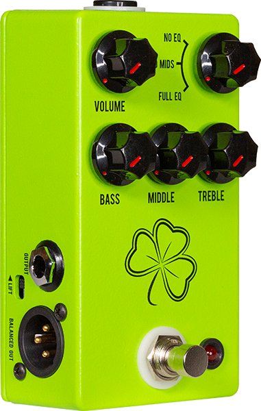 The Clover has four standard controls and one rotary switch on the top. The Volume control allows you to set your volume at unity or as a boost to push your amp or dirt pedals. There are three EQ controls to give you tons of control to cut or boost Bass, Mids, and Treble. The rotary switch has three settings: Full EQ, No Mid, and No EQ. When set to Full EQ all three EQ controls are in operation, giving you full control over the full range of EQ available. The No Mid setting is an exact replica of the original FA-1, removing the ability to control the Mids and leaving them in a fixed setting. When in the No EQ mode all the EQ settings are removed and the Clover becomes a straight FET boost, perfect for pushing an amp. On the right side of the pedal there is a Low Cut dip switch. This removes some of the lows if you feel your tone is too muddy and can help you cut through a mix.