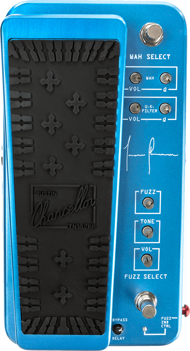 The Justin Chancellor Cry Baby Wah is a multi-tool of sonic craftsmanship, combining three separate effects into a single pedal: the fluid expressiveness of a custom midrange filter, the bright aggression of a custom wah circuit, and the chainsaw grind of a vintage fuzz. It's the perfect complement to bass player Justin Chancellor's multi-dimensional role in the band Tool. Whether opening up soundscapes with chords and harmonics or syncing up with guitarist Adam Jones to perform arresting single-note unison runs, Justin goes above and beyond the traditional boundaries of his instrument to help compose the band's multi-layered tunes. He is, without a doubt, one of the modern pioneer users of effects on bass, and he keeps a carefully configured pedalboard at his disposal for crafting tones and exploring sounds. This custom Cry Baby Wah combines some of his favorite ways to do just that—filter, wah, and fuzz.