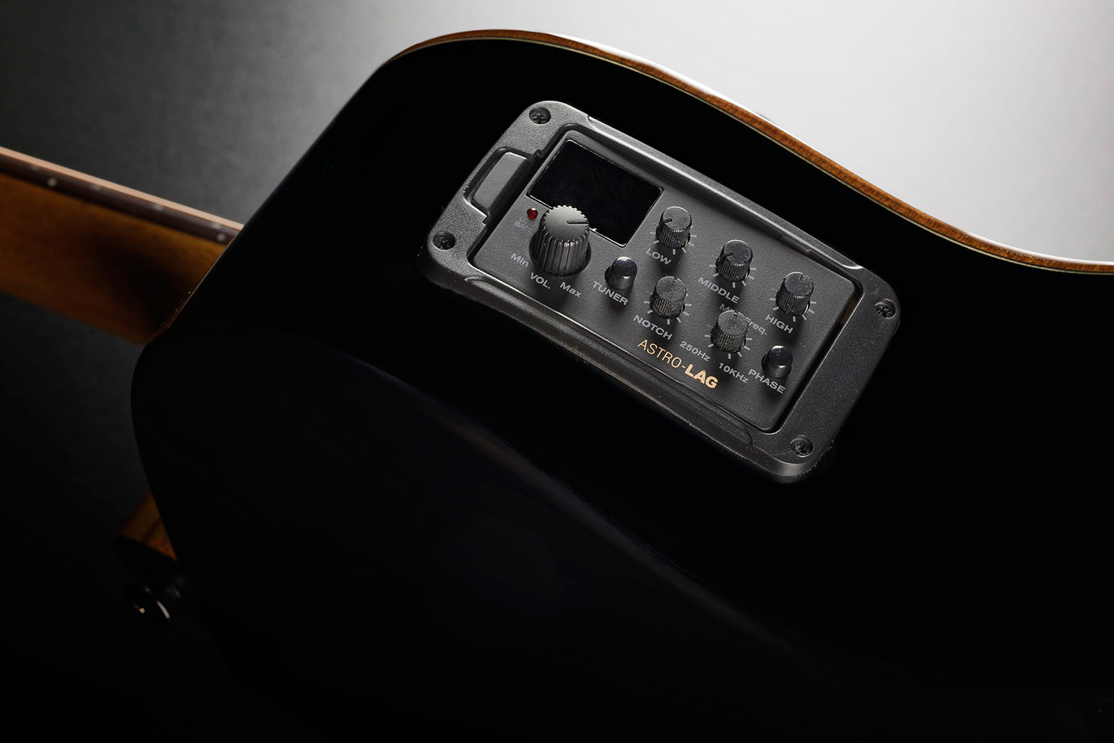 The very attractive and comfortable with a beveled armrest, the LAG Tramontane T118ABCE (Black) is an Auditorium steel string acoustic/electric guitar of interest ! it features solid Red Cedar top, layered Khaya back/sides/neck, Khaya neck and Brownwood fingerboard/bridge. It benefits from excellent craftmanship, and provides warm, rich and dynamic sounds.