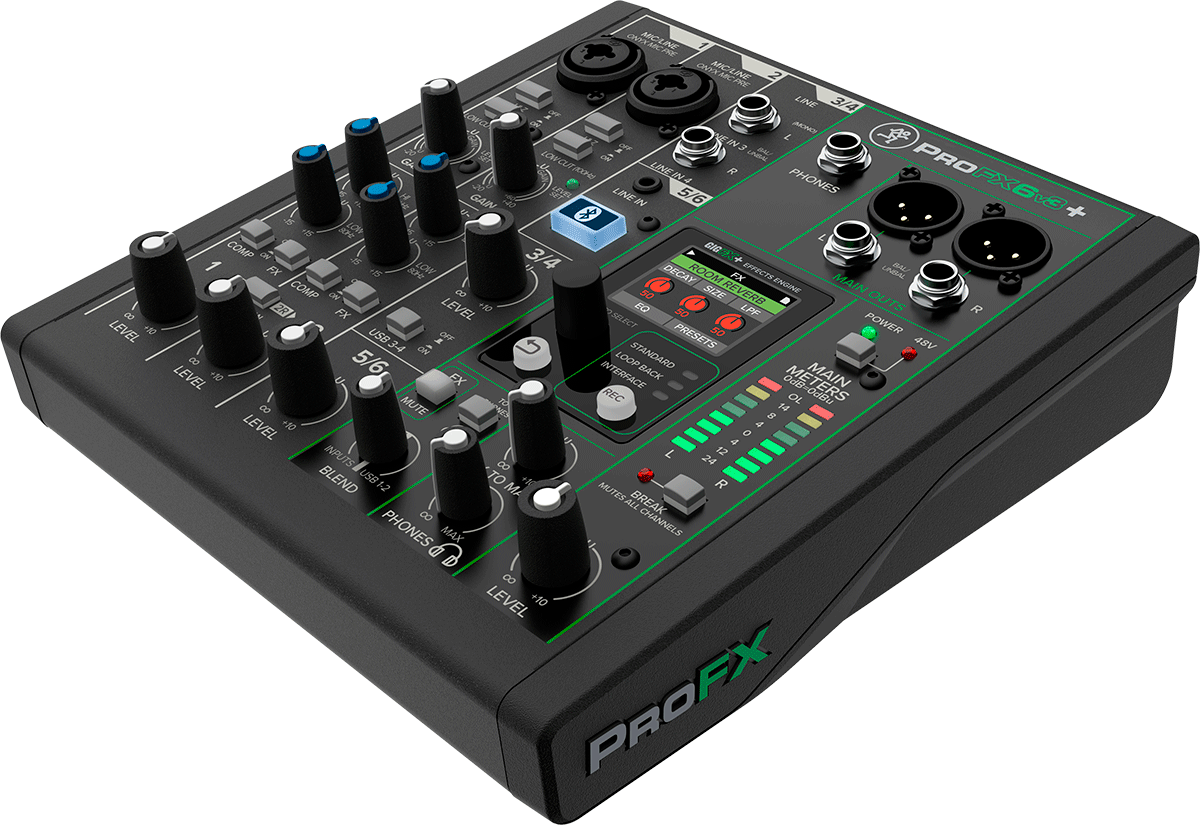 Discover the ProFX6v3+, a compact analog mixer and USB-C audio interface, the true heart of a studio recording console. Essential mixing tools such as single-knob compression, 2-band EQs, high-impedance (Hi-Z) switches, and 100 Hz low-cut filters make this device the perfect centerpiece for your studio.
