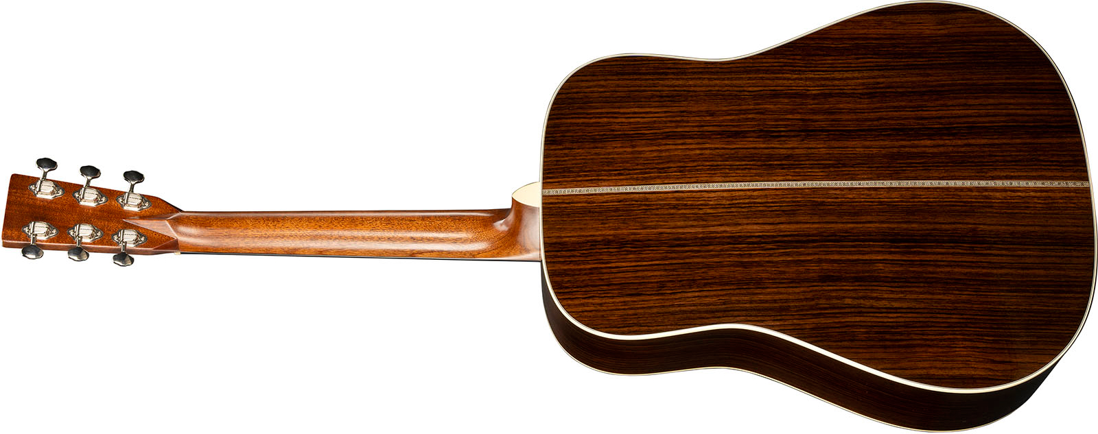 Inspired by Billy Strings' prized 1940 D-28, the MARTIN GUITAR Billy Strings D-28 brings a modern twist to a classic pre-war design, incorporating features tailored to Billy's electrifying playing style. This signature Dreadnought showcases a unique 25" scale length, reducing string tension for fast, intricate playing and expressive bends – perfectly suited for Billy’s rapid-fire licks. With a custom nut width that’s slightly wider than his pre-war Martin and a modified low oval satin neck, it offers enhanced comfort and speed, ideal for players who crave agility up and down the neck. The solid East Indian rosewood back and sides and spruce top deliver a full, resonant tone with rich bass, while the bold herringbone trim, antique toner, and antique white binding add vintage flair. Nickel enclosed gear tuners, exclusive to Martin, and an ebony fingerboard with abalone diamond and square inlay round out the guitar’s looks and performance. It’s an ideal balance of traditional craftsmanship and modern playability, much like Billy’s genre-defying style. Each guitar features a custom paper label with his pre-printed signature and graphic.