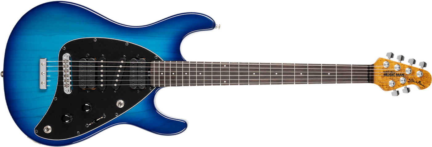 MUSIC MAN Steve Morse (Morse Blue Burst) is a high quality instrument merging traditional construction with ultra flexible electronics featuring one Humbucker DiMarzio DP-205 Morse Signature, one Single coil DiMarzio DP-108 Vintage, one Single coil custom Ernie Ball Music Man and one Humbucker DiMarzio DP-200 Morse Signature.