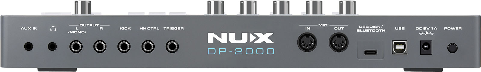 - AUX IN, PHONES, OUTPUT, KICK, HH CTRL, TRIGGER IN, MIDI IN/OUT, USB DISK/BLUETOOTH MODULE, USB, DC IN 9V