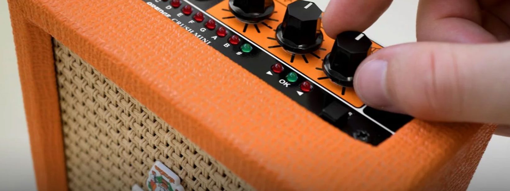 Working with a 9v battery or optional power adaptor, and equipped with a built-in tubner, the 3 watts ORANGE Crush Mini is the smallest amplifier electric guitar from Orange. It gives you classic Orange tone , whether warming up backstage on the road, at practice, or in your bedroom.
