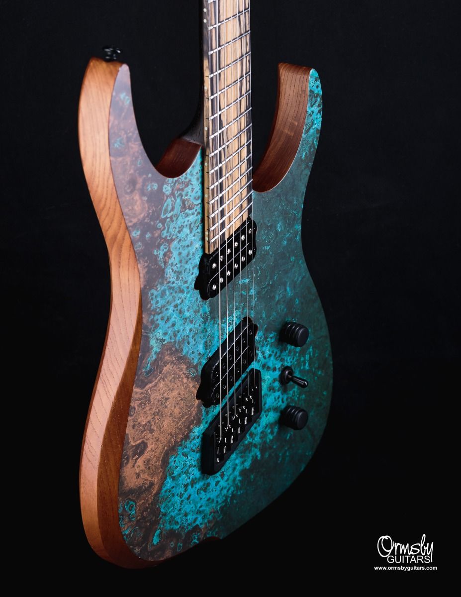 The ORMSBY Hype GTR Elite 8 (Copper Print) eight string / multi-scale / fanned frets solid body electric guitar is a modern take on an american classic, with an ergonomy optimized for Djent Metal and siblings styles playing techniques and sounds.