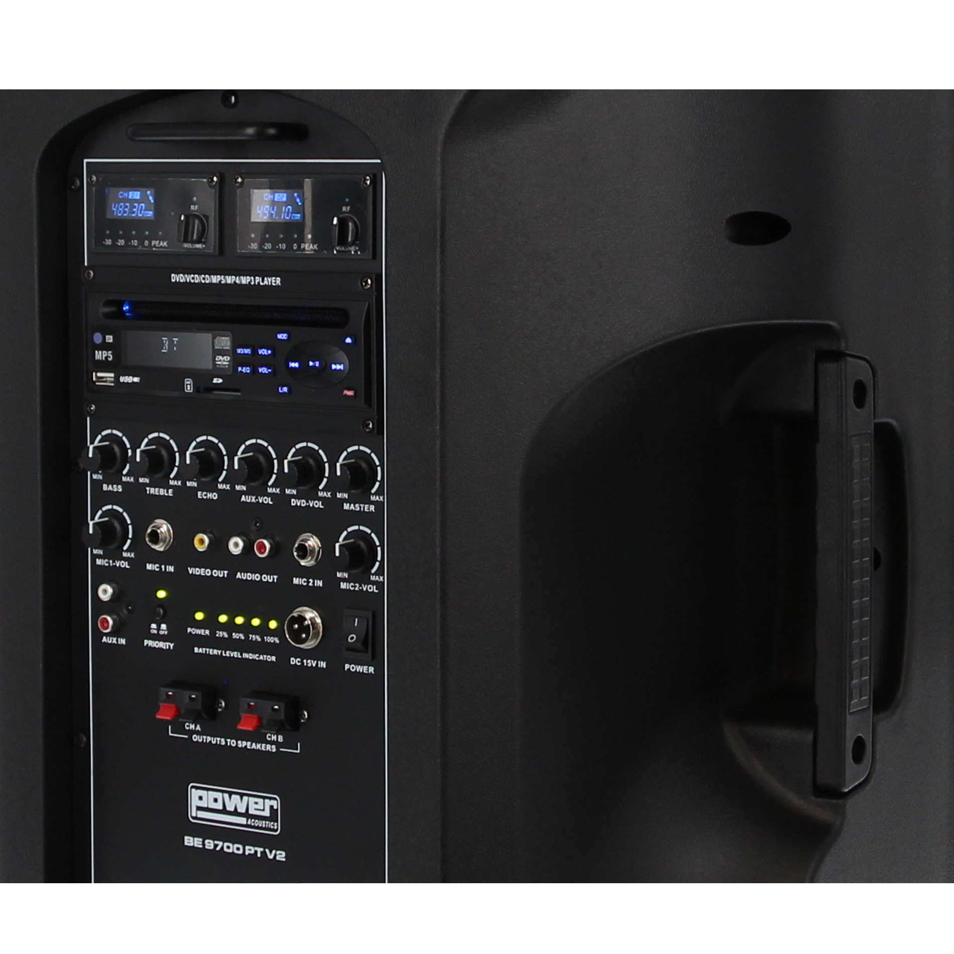 The Power Acoustics BE9700 PT V2 is a Portable PA system with MP3/SD/DVD/USB/DIVX/Bluetooth CD player + 2 handheld microphones and 2 UHF headphones.