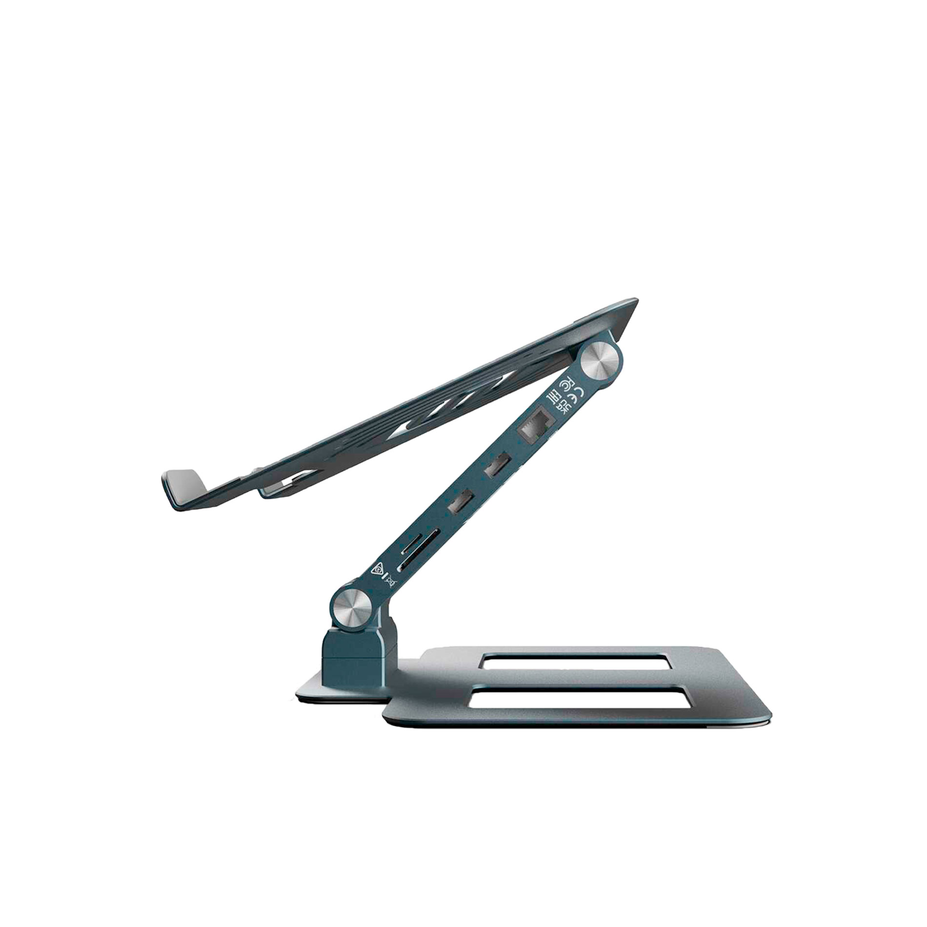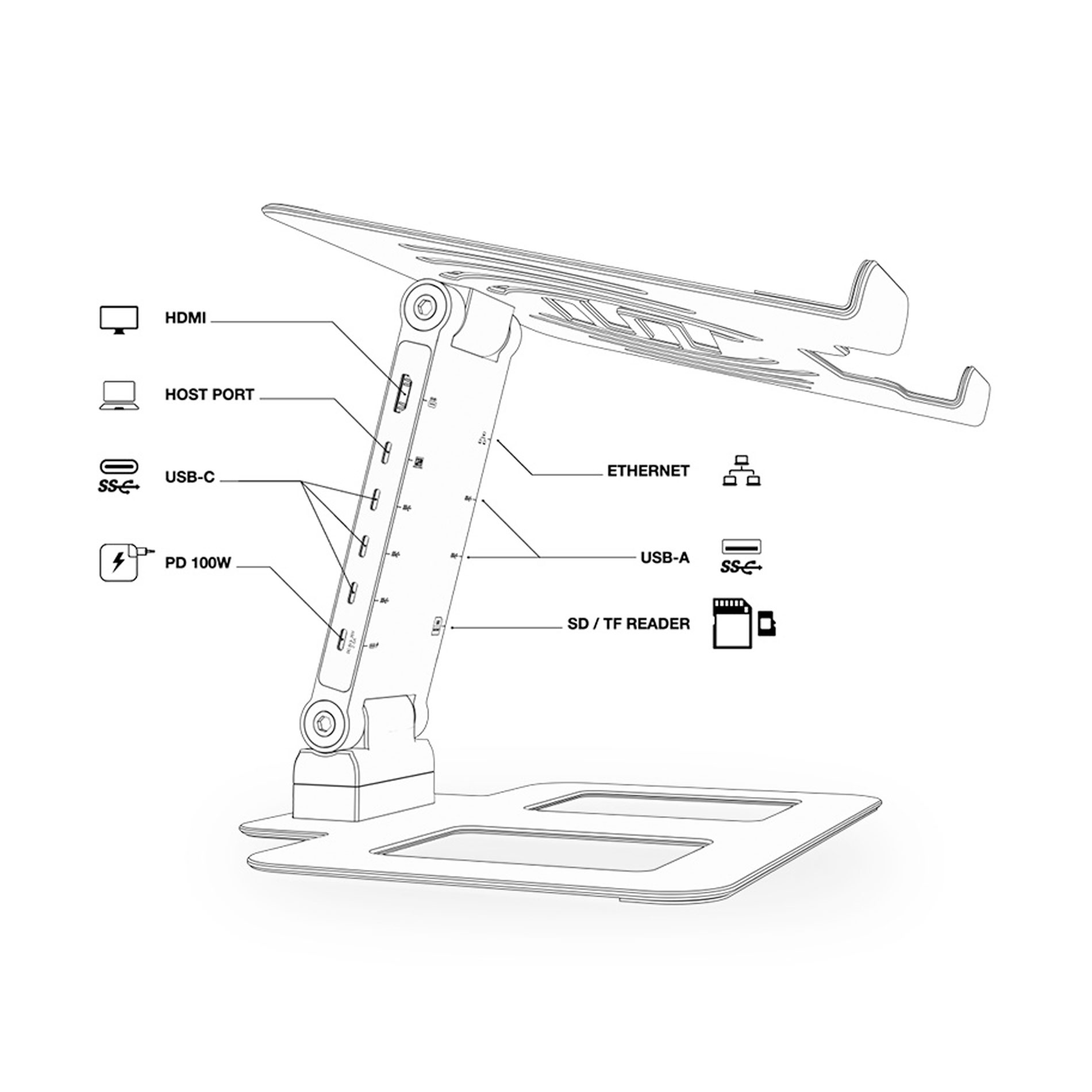 This laptop stand, heir to the success of its predecessor, stands out with its 10-in-1 multimedia hub and its integrated battery. It offers DJs, artists and content creators new connection possibilities, with USB-C, USB-A, HDMI, Ethernet and SD card reader. Versatile, it will be your ideal ally for mixing, video editing, production, home use and DJ performances.