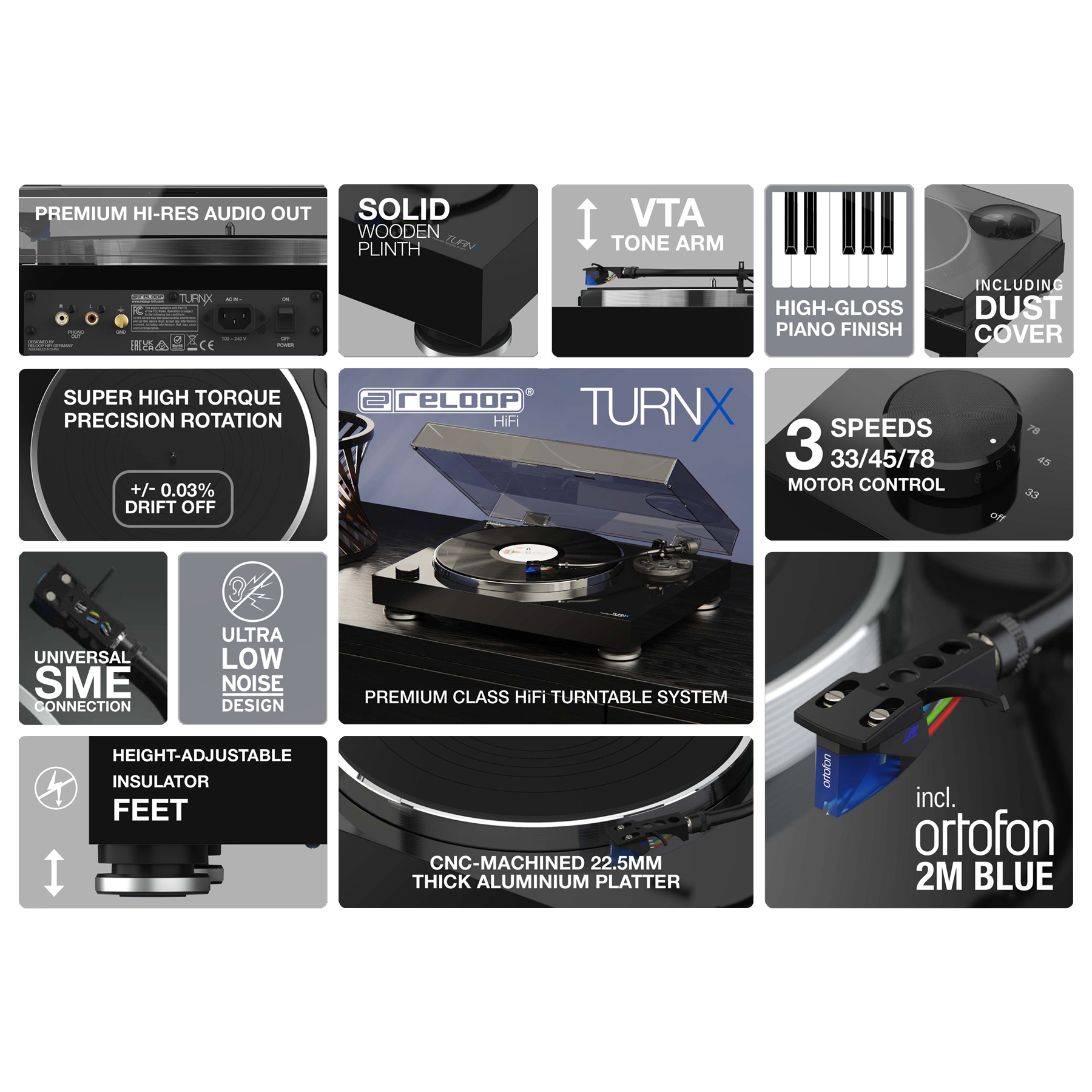 The Reloop Turn X is an audiophile turntable offering high quality music thanks to a low-vibration motor, an S-arm and an Ortofon 2M Blue cell.