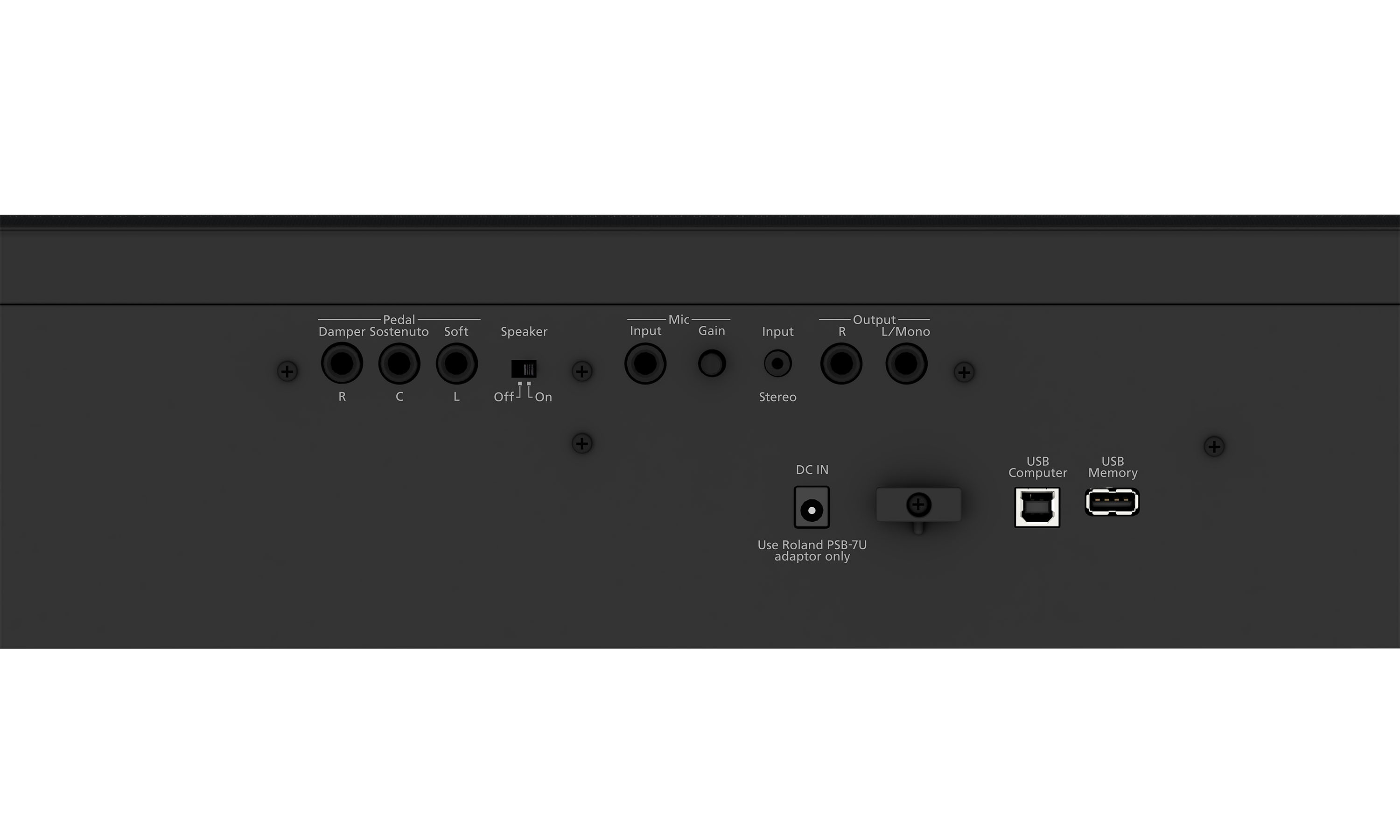 - 1x stereo output (6.3 mm jack x2), 2x stereo headphone outputs (3.5 mm and 6.3 mm jack), 1x stereo input (3.5 mm jack), 3x pedal inputs (Damper, Sostenuto, Soft - 6.3 mm jack each)
