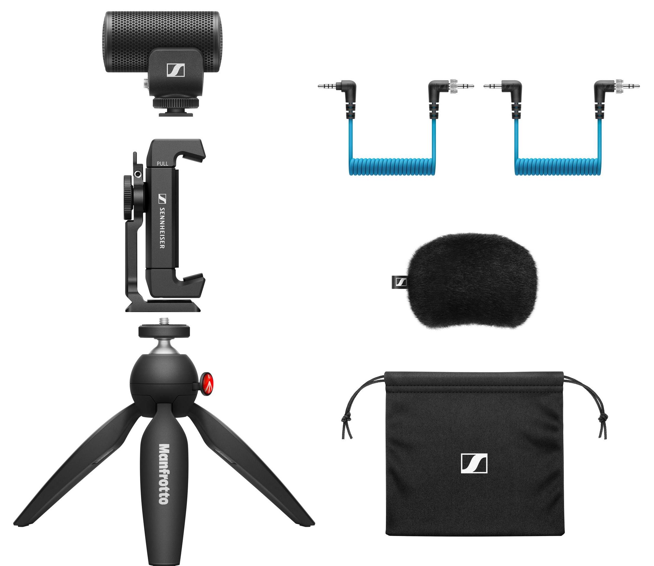Includes (1) MKE 200 camera microphone, (1) Manfrotto PIXI mini tripod, (1) Smartphone clip with passive accessory shoe, (1) 3.5mm TRS coiled cable - TRS, (1) 3.5mm TRS coiled cable - TRS, (1) 3.5mm TRS coiled cable - TRS