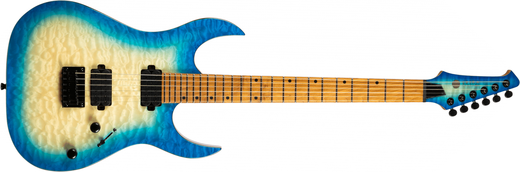 It features a Mahogany body, a Quilt Maple top a roasted Maple bolt-on neck, a roasted Maple or Ebony fretboard with 24 frets, agressive Spira Villain humbucking pickups with ceramic magnets and fixed bridge.