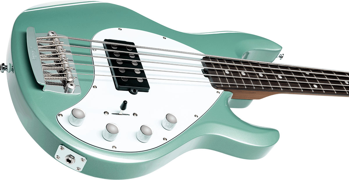 The STERLING BY MUSIC MAN Stingray 5 Ray35 (RW, DRG) 5-string solid body electric bass features a Mahogany modern contoured body, roasted Maple neck, Rosewood or roasted Maple neck depending on colors, humbucking alnico magnets pickup, a 3-band active preamp, and a bridge modeled after the iconic Ernie Ball Music Man StingRay.