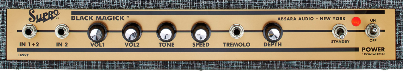 The SUPRO Black Magick (1695TJ) combo for electric guitar is a faithful recreation of one of rock & roll's holy grail amplifiers. Its circuitry, build and cosmetics are modeled after Jimmy Page's beloved 1959 Supro combo, famous for offering most of the tones heard on Led Zeppelin I.